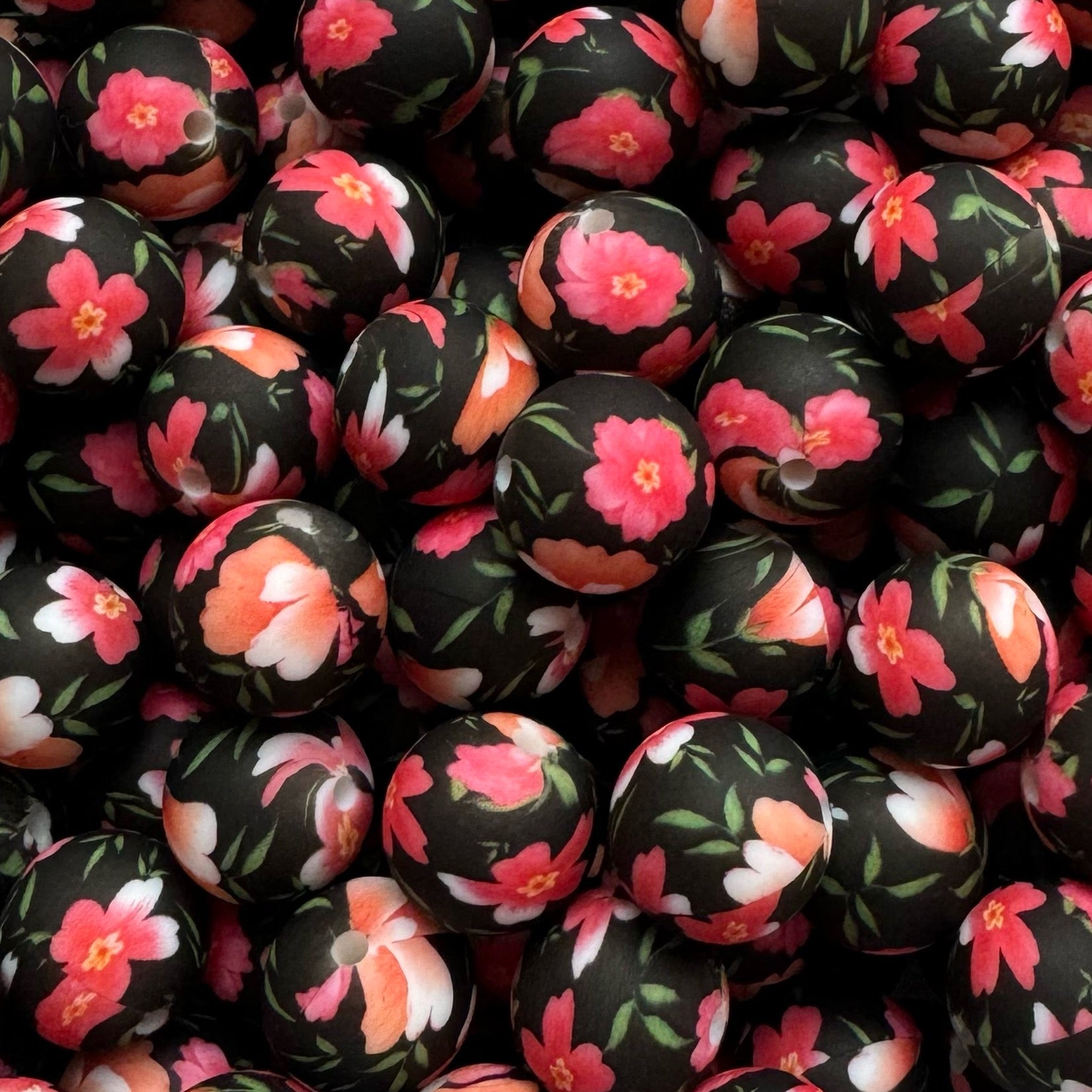 15mm Bright Floral on Black Silicone Bead