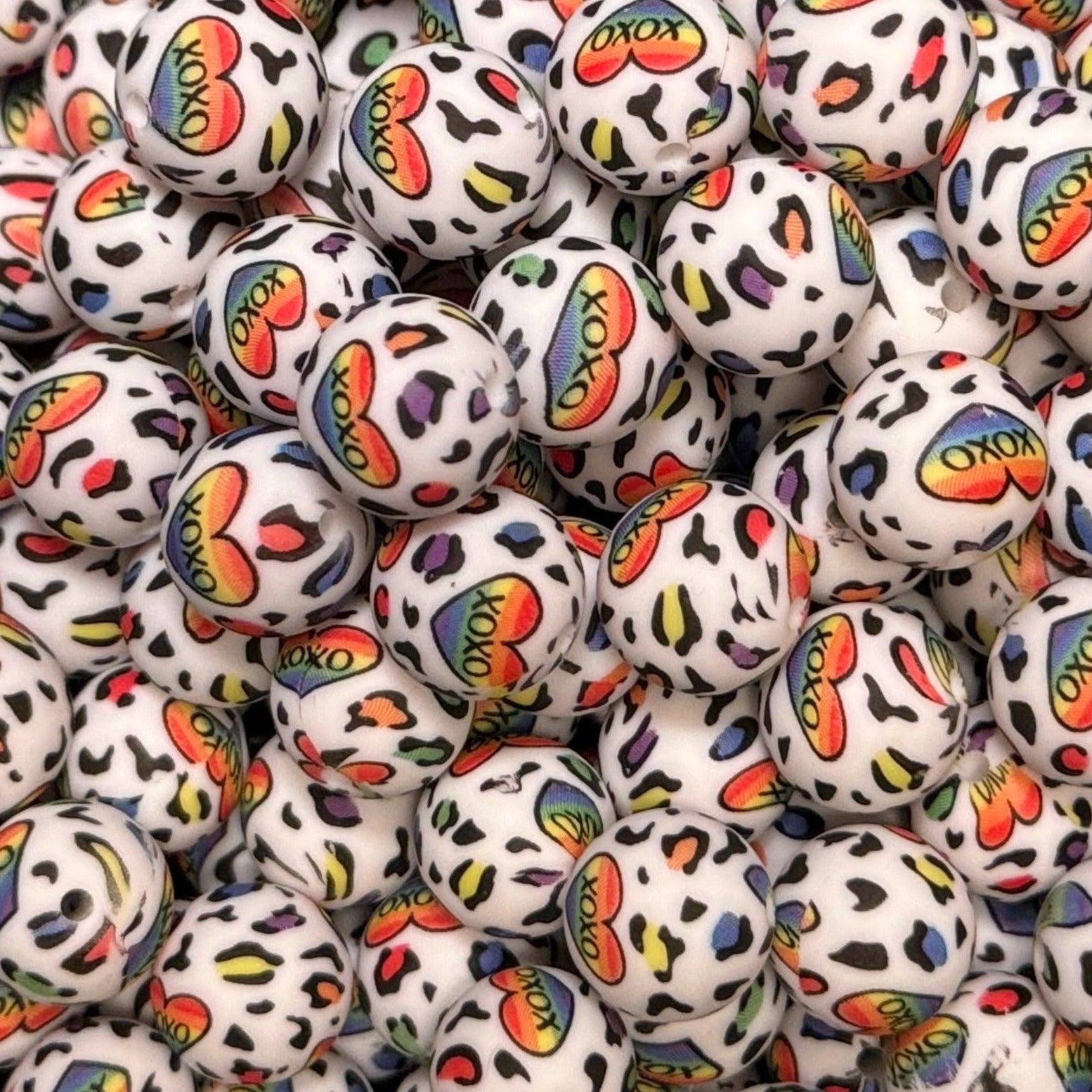 15mm Rainbow Leopard Conversation Heart Silicone Bead