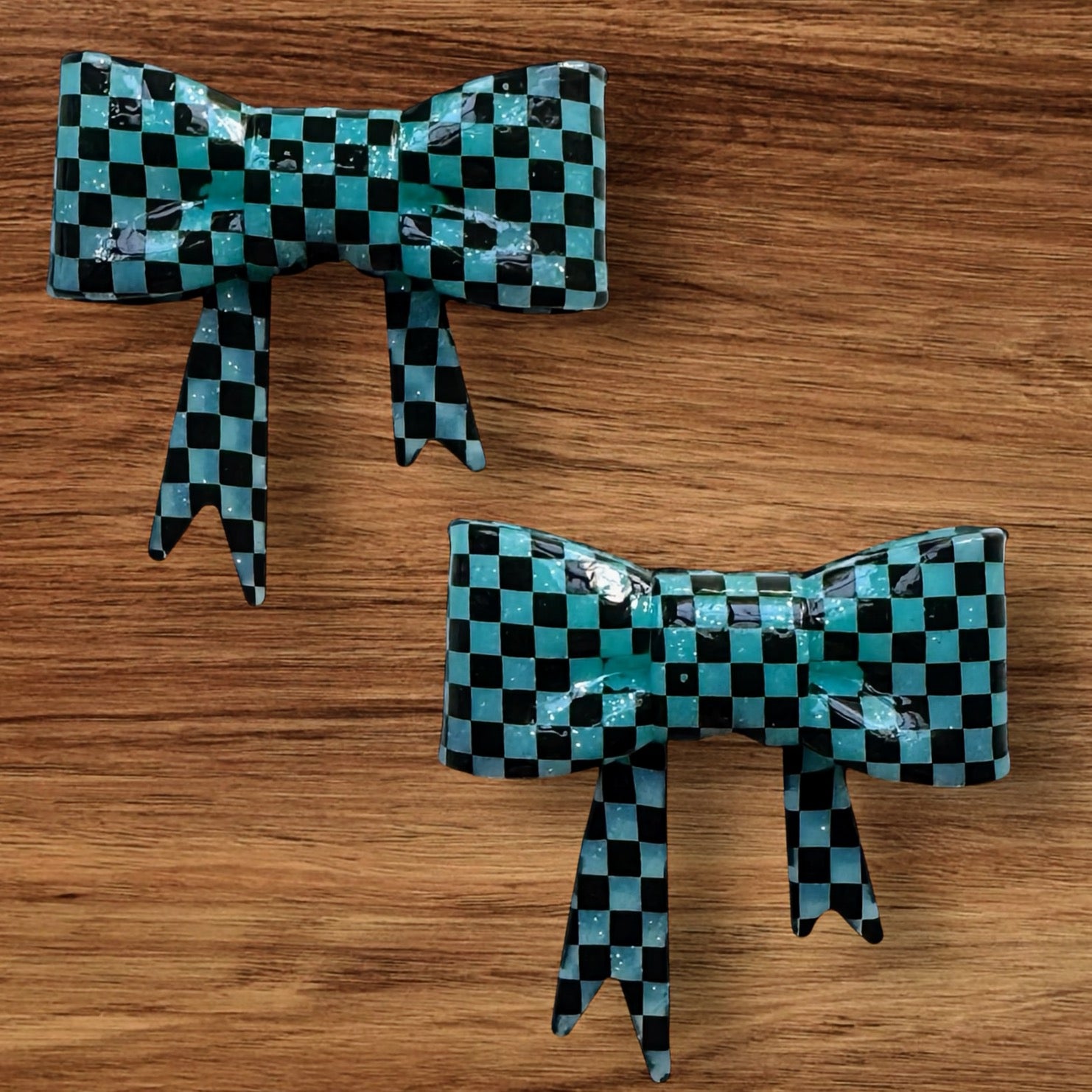 Shiny Turquoise Checkered Bow Focal/Straw Topper